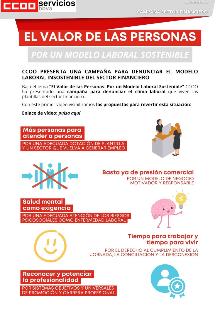 Bajo el lema “El Valor de las Personas. Por un Modelo Laboral Sostenible” CCOO ha presentado una campaña para denunciar el clima laboral que viven las plantillas del sector financiero.