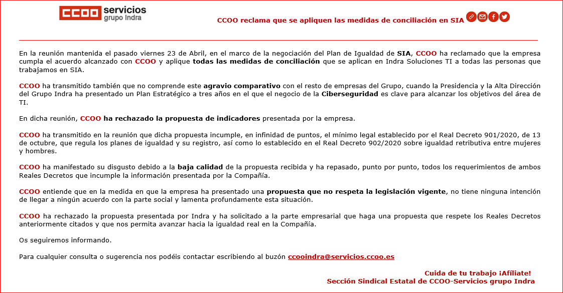 CCOO reclama que se apliquen las medidas de conciliación en SIA