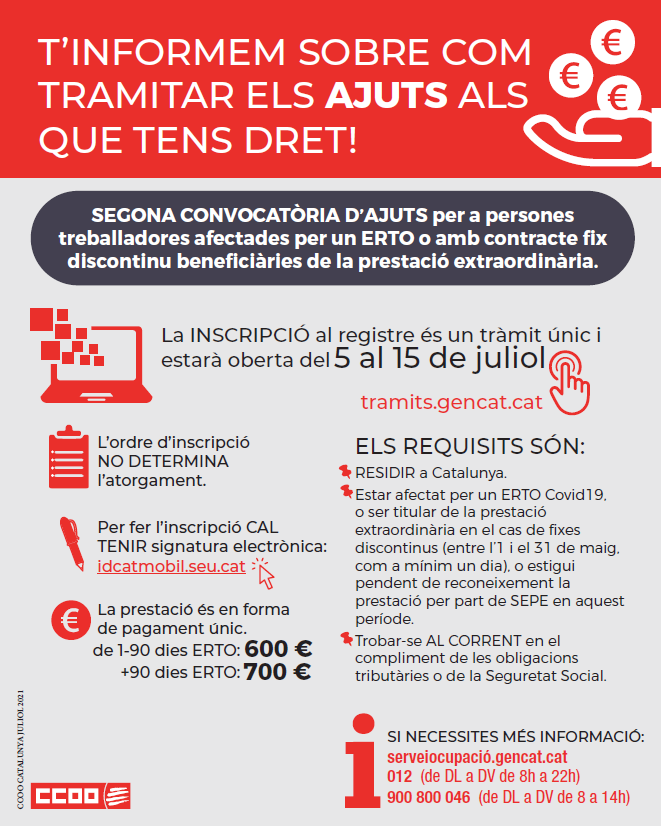 El 5 de julio se abrirá un nuevo formulario de inscripción para acceder a la línea de ayudas para personas afectadas por un ERTE, o bien con contrato fijo discontinuo beneficiarias de la prestaciones extraordinaria, como mínimo, un día del mes de mayo de 2021. Estas son las segundas syudas para trabajadores y trabajadoras en EERTE pactadas en el Diálogo social donde han estado una especial reivindicación de CCOO de Catalunya.