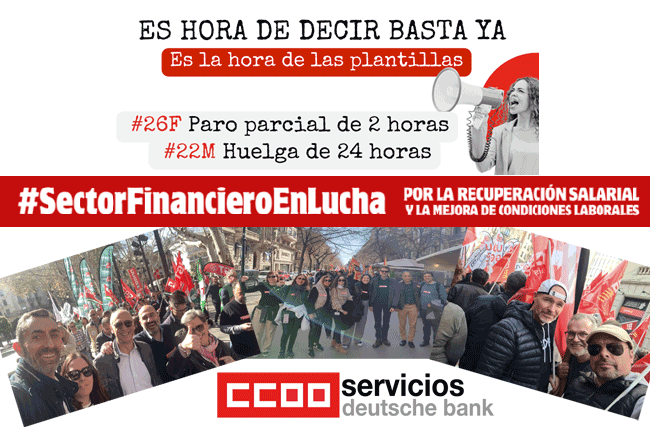 Desde CCOO os pedimos que sigáis apoyando estas reivindicaciones con tu firma así como en el paro de 2 horas en todo el sector financiero del lunes 26 de febrero (de 8:00 a 10:00) y en la huelga de 24 horas del viernes 22 de marzo, si no se producen avances suficientes.