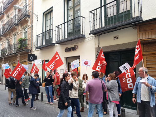 La Federación de Servicios de CCOO de Madrid se ha concentrado este martes bajo el lema «Clarel nos ahoga, queremos un trabajo digno» para exigir unas mejores condiciones laborales para la plantilla de perfumerías Clarel.