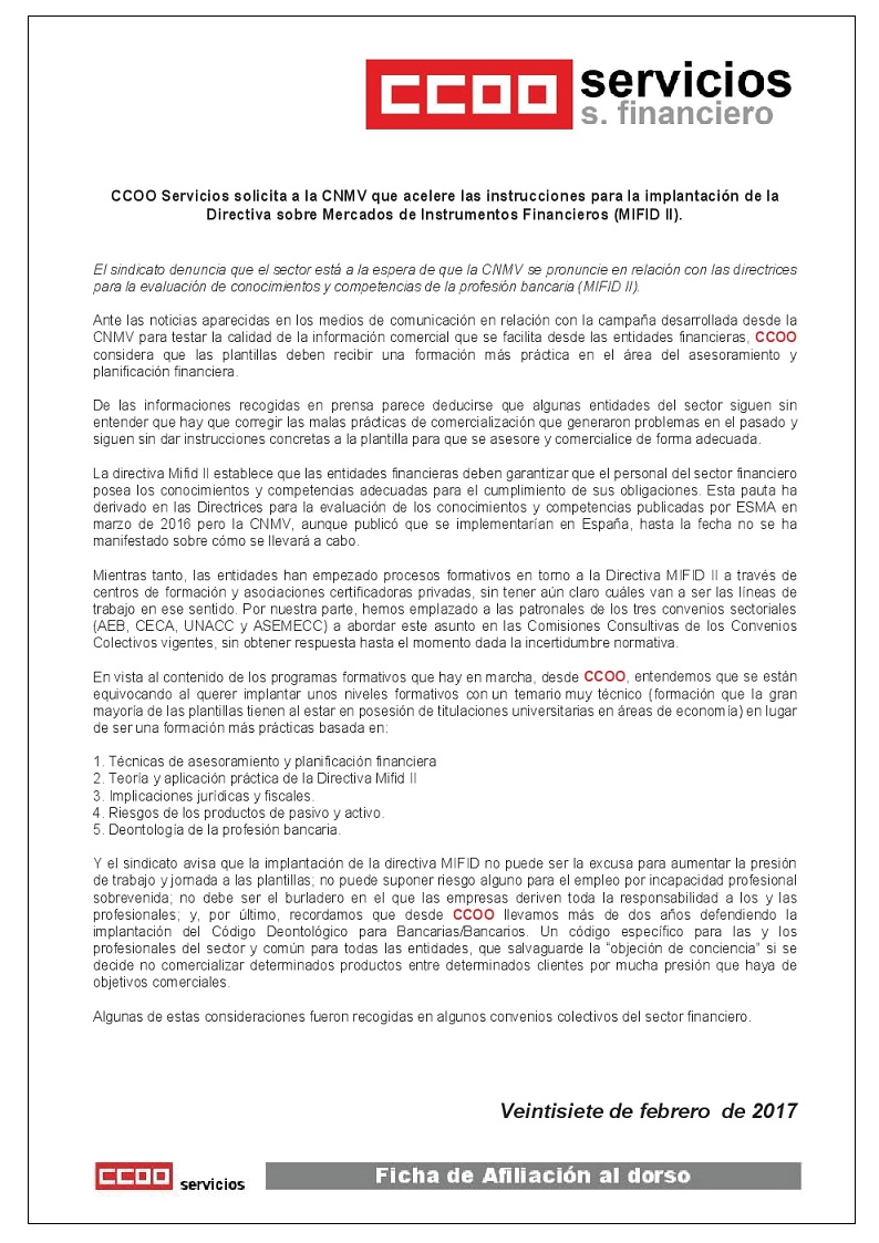 CCOO solicita a CNMV que se pronuncie sobre Mifid II