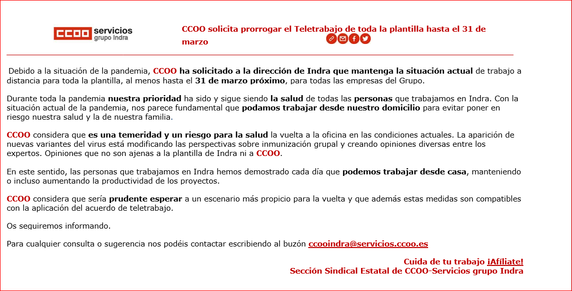 CCOO solicita prorrogar el Teletrabajo de toda la plantilla hasta el 31 de marzo