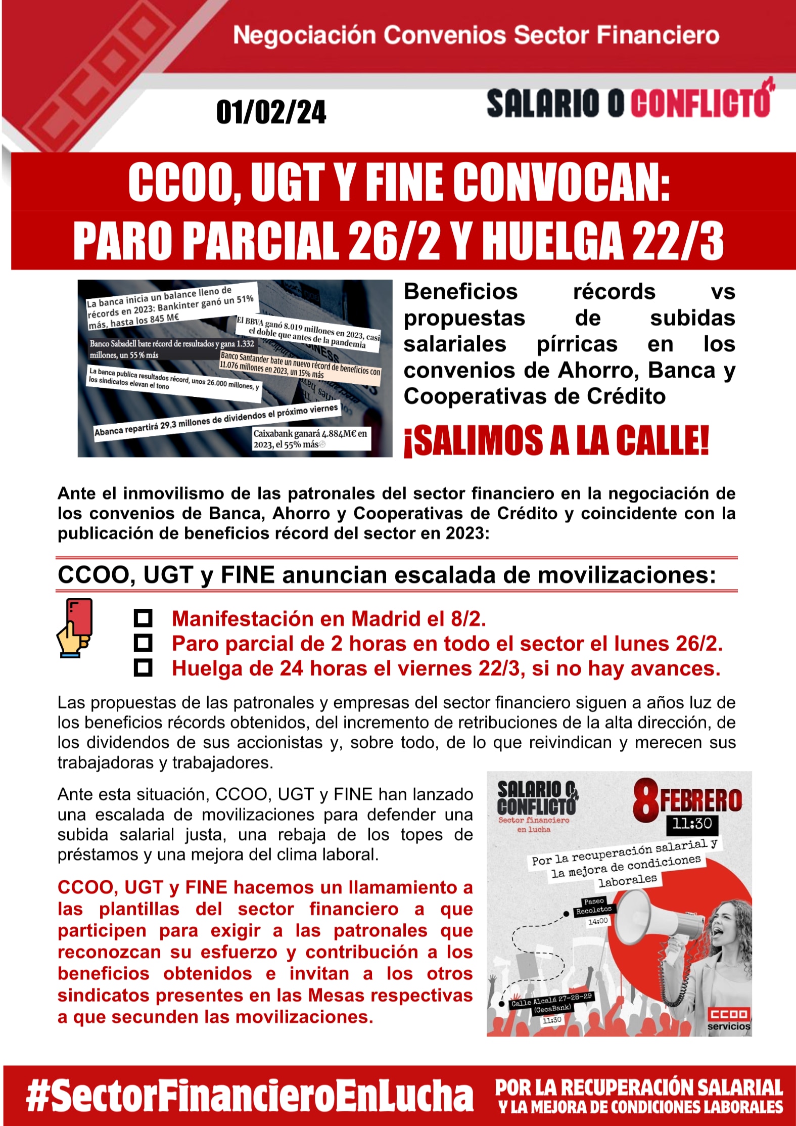 CCOO, UGT Y FINE convocan: paro parcial 26/2 y huelga 22/3