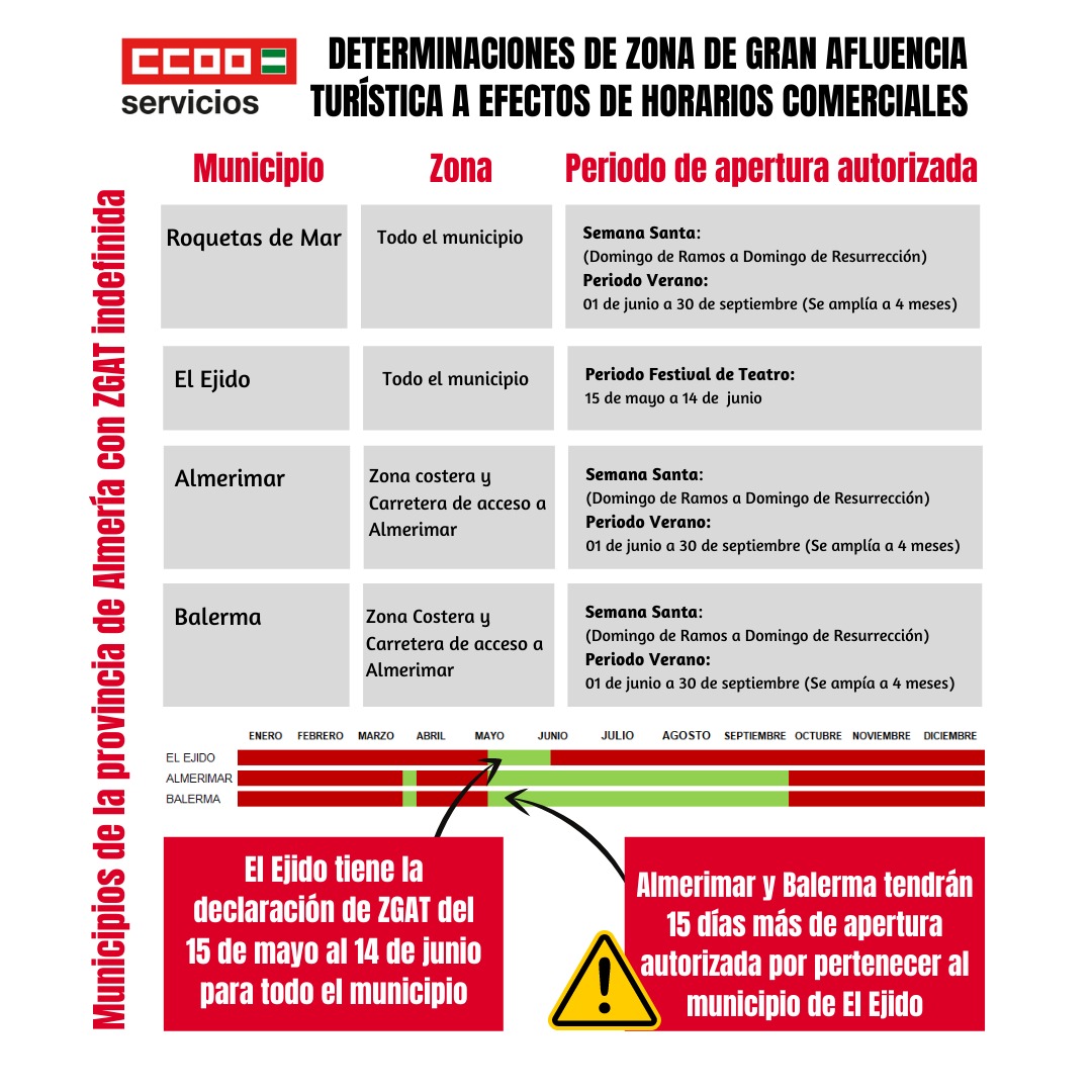 El Consejo Andaluz de Comercio ha aprobado por mayoría y con el voto en contra de CCOO, la ampliación de las zonas de gran afluencia turística durante el periodo de verano que se amplía de dos meses y medio a cuatro meses, toda la Semana Santa incluyendo el Domingo de Ramos hasta el Domingo de Resurrección para la zona de Almerimar, Balerma y Carretera de Almerimar.