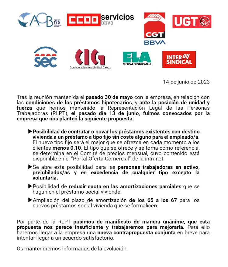Tras la reunión mantenida el pasado 30 de mayo con la empresa, en relación con las condiciones de los préstamos hipotecarios, y ante la posición de unidad y fuerza que hemos mantenido la Representación Legal de las Personas Trabajadoras (RLPT), el pasado día 13 de junio, fuimos convocados por la empresa que nos planteó la siguiente propuesta: