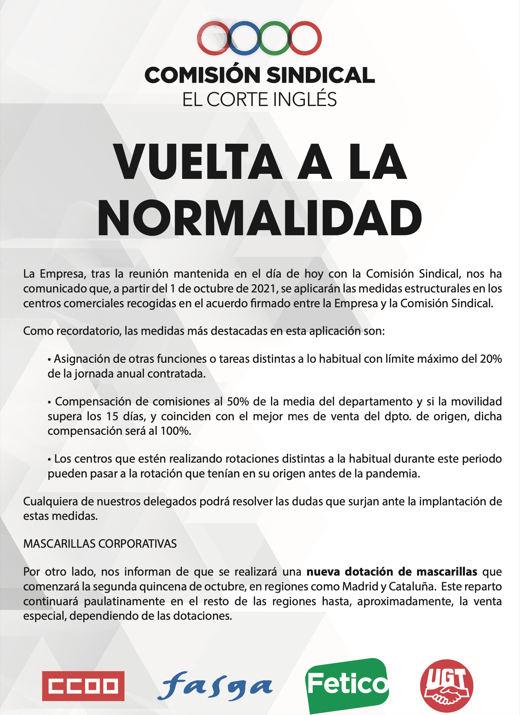 La Empresa comunica a la Comisión Sindical que, a partir del 1 de octubre de 2021, se aplicarán las medidas estructurales.
