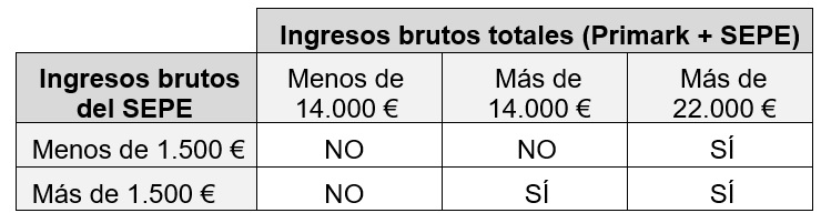 Para simplificar todo lo anterior, CCOO hemos realizado una tabla resumen donde podrás comprobar si tienes la obligación o no de presentar la Declaración de la Renta en función de tus ingresos brutos totales y de lo que te pagó el SEPE mientras estuviste de ERTE durante el 2020: