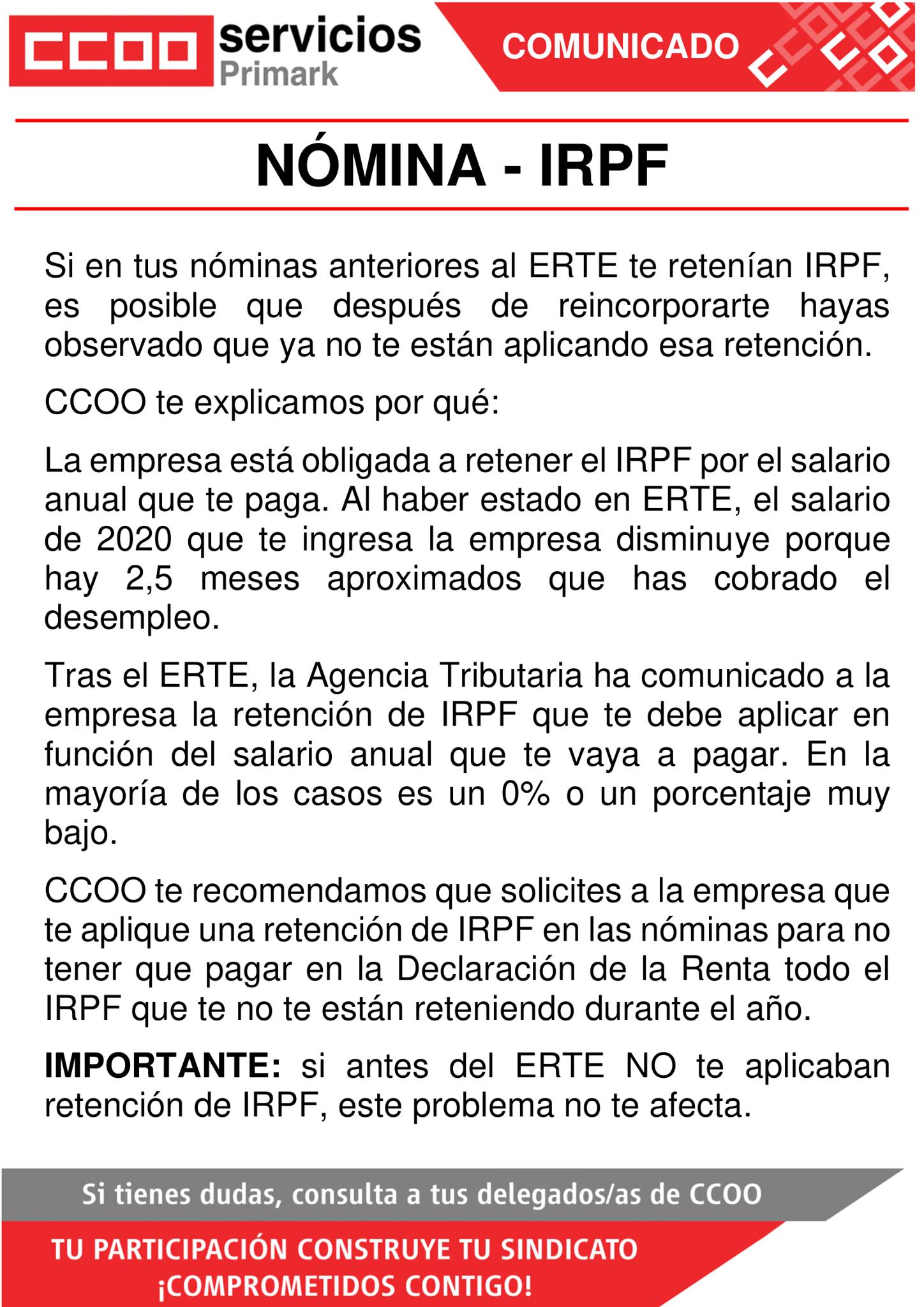 En su momento CCOO ya avisamos que para evitar posibles sustos era recomendable que solicitases al departamento de P&C que te aumentasen la retención de IRPF en las nóminas hasta que finalizara el año. De esta forma, se podría intentar compensar lo que te estuvieron reteniendo de menos.