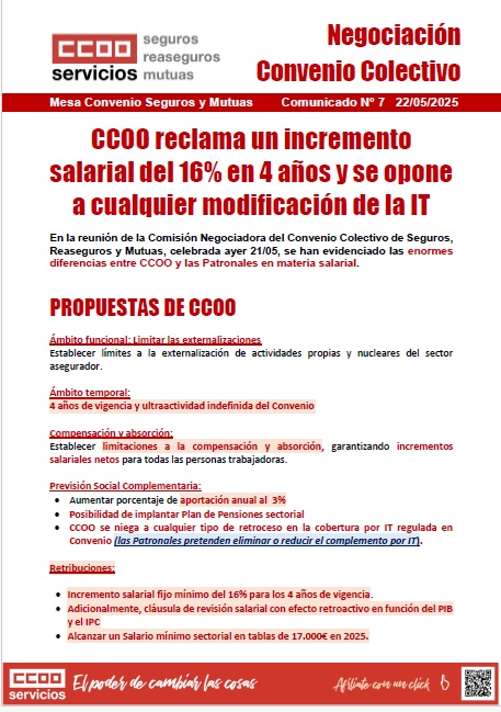 CCOO RECLAMA UN INCREMENTO SALARIAL DEL 16% EN 4 AÑOS Y SE OPONE A CUALQUIER MODIFICACIÓN DE LA IT.