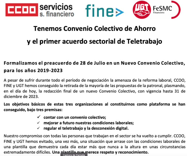 A pesar de sufrir durante todo el período de negociación la amenaza de la reforma laboral, CCOO, FINE y UGT hemos conseguido la retirada de la mayoría de las propuestas de la patronal, plasmando, en el día de hoy, la redacción final de un nuevo Convenio Colectivo, con vigencia hasta 31 de