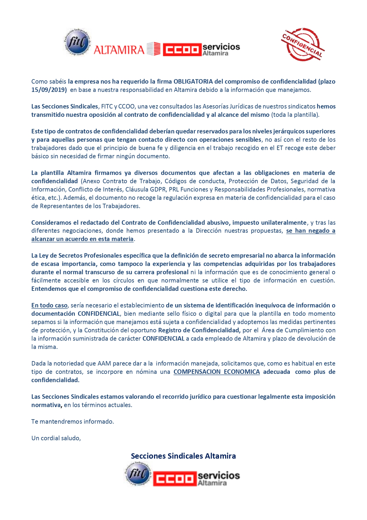 Las Secciones Sindicales, FITC y CCOO, una vez consultados las Asesorías Jurídicas de nuestros sindicatos hemos transmitido nuestra oposición al contrato de confidencialidad y al alcance del mismo (toda la plantilla).