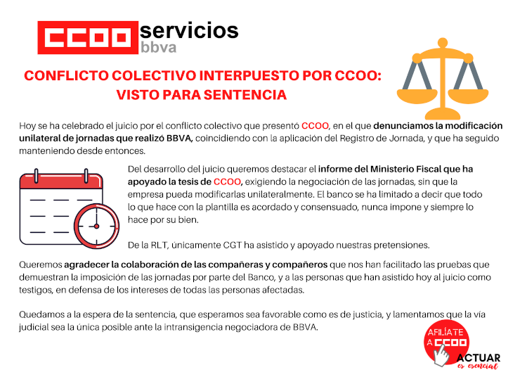 Hoy se ha celebrado el juicio por el conflicto colectivo que presentó CCOO, en el que denunciamos la modificación unilateral de jornadas que realizó BBVA, coincidiendo con la aplicación del Registro de Jornada, y que ha seguido manteniendo desde entonces.