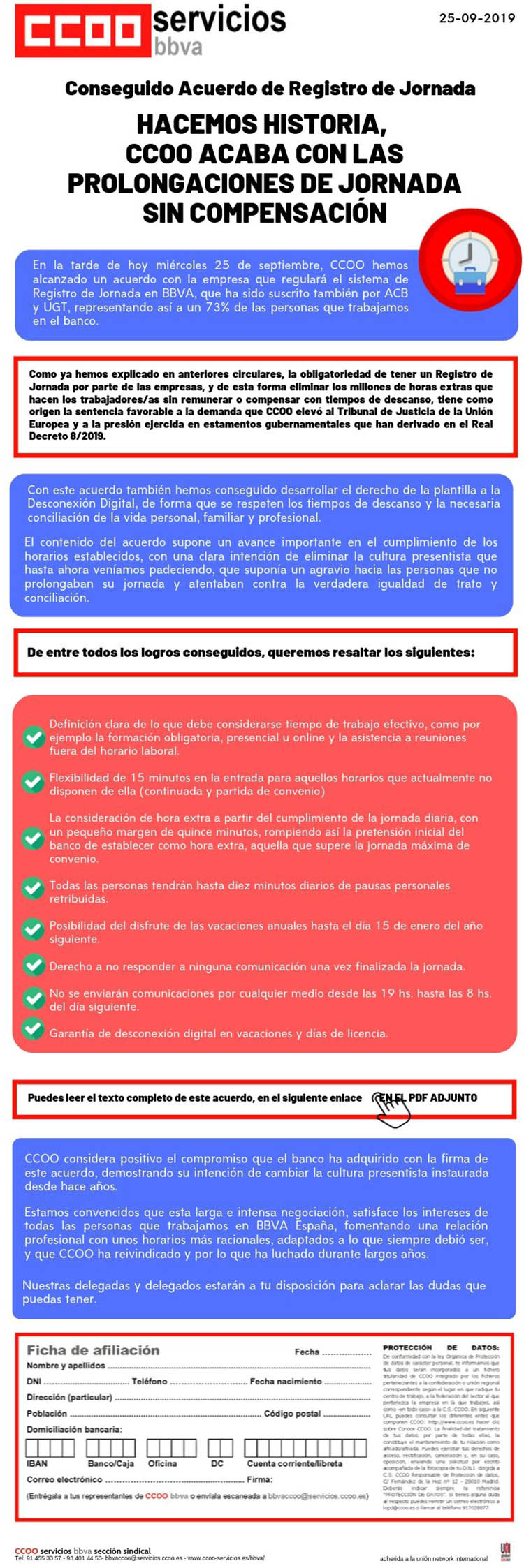 En la tarde del miércoles 25 de septiembre, CCOO hemos alcanzado un acuerdo con la empresa que regulará el sistema de Registro de Jornada en BBVA, que ha sido suscrito también por ACB y UGT, representando así a un 73% de las personas que trabajamos en el Banco.