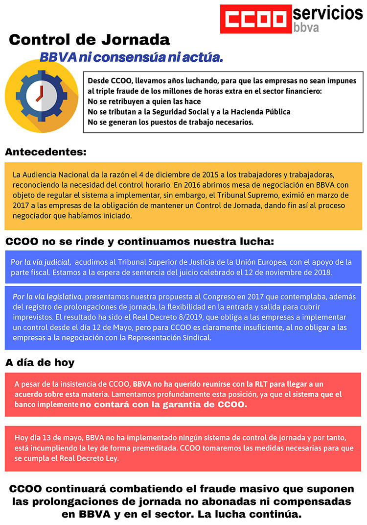 Desde CCOO, llevamos años luchando, para que las empresas no sean impunes al triple fraude de los millones de horas extra en el sector financiero: No se retribuyen a quien las hace. No se tributan a la Seguridad Social y a la Hacienda Pública. No se generan los puestos de trabajo necesarios.