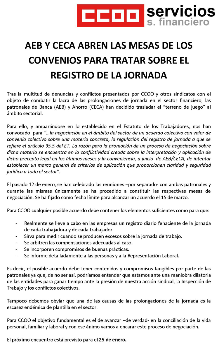 Tras la multitud de denuncias y conflictos presentados por CCOO y otros sindicatos con el objeto de combatir la lacra de las prolongaciones de jornada en el sector financiero, las patronales de Banca (AEB) y Ahorro (CECA) han decidido trasladar el «terreno de juego» al ámbito sectorial.