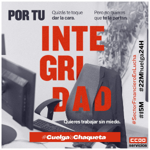 Este 15M CCOO trasladará su rechazo a esta estrategia a las puertas de la JGA de BBVA y concentrándose en otras entidades, presión que continuará el 22M en la JGA de B. Santander y convocatoria de huelga de 24h el mismo 22M. Los accionistas deben conocer como tratan a las plantillas estas entidades, las cuales adolecen de una RSE. AEB es la única responsable de mantener el malestar social y tiene oportunidad en la próxima reunión del 19 de marzo de acercar sustancialmente las posiciones.