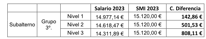 Dado que el importe total (salario base + salario variable) del Grupo 3° referenciado (el "Salario 2023") es inferior al salario mínimo interprofesional de 2023 (el "SMI 2023"), se acuerda que, a las personas trabajadoras encuadradas en tal Grupo, se les abonará la cantidad que corresponda, en su caso, para que su retribución global alcance el SMI 2023. A modo de ejemplo, en los casos en los que su retribución se corresponda con el Salario 2023, la cantidad a abonar será la indicada en la columna "C. Diferencia":