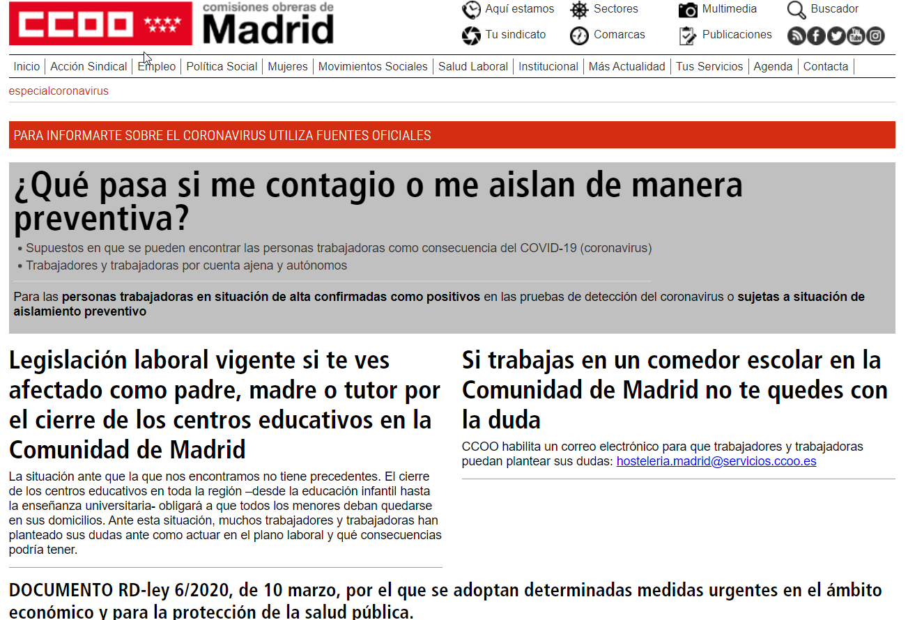 En esta web especial coronavirus de CCOO Madrid tienes toda la información, preferentemente laboral, que vaya surgiendo sobre la epidemia