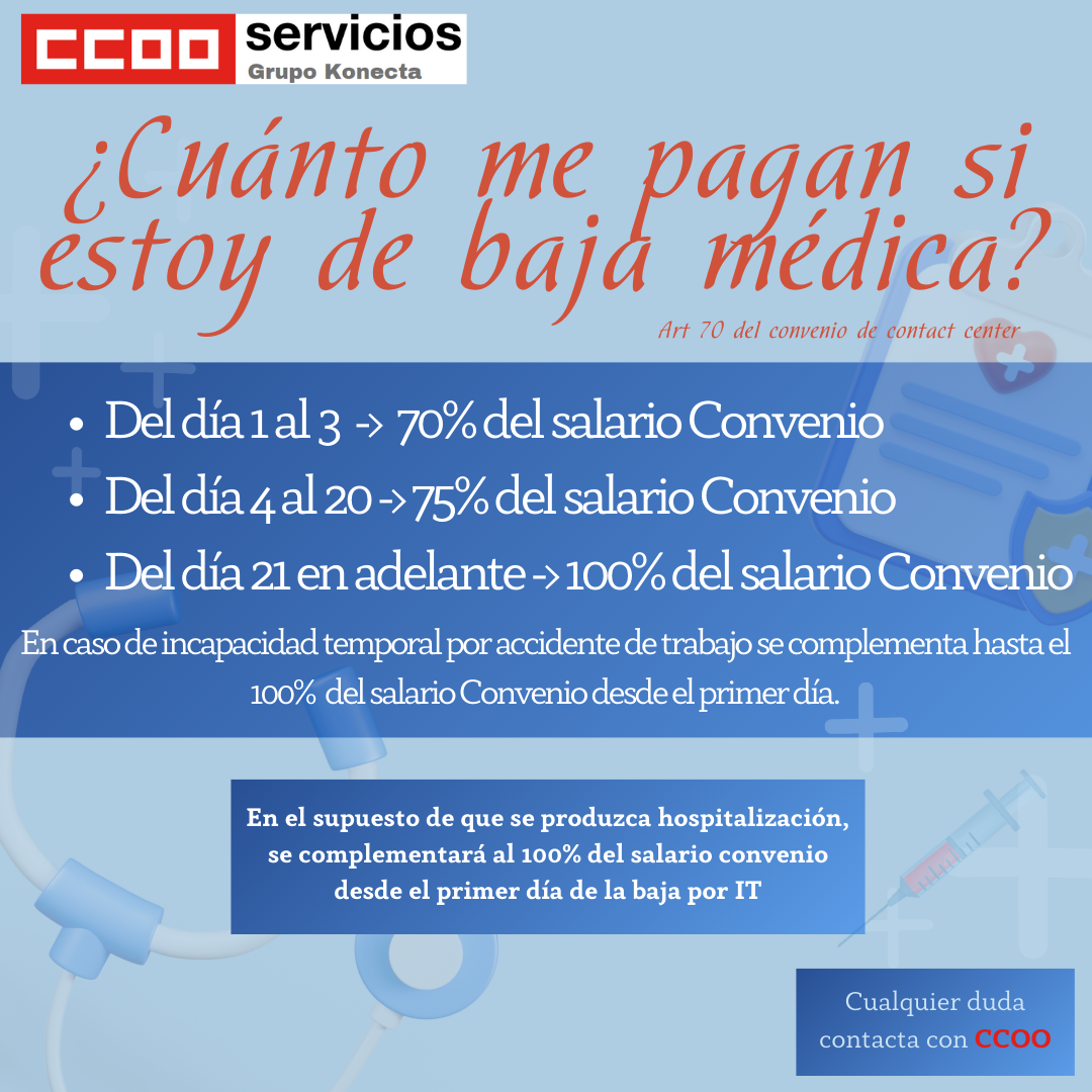 De acuerdo con el artículo 70 del Convenio de Contact Center, los complementos salariales durante una baja médica se distribuyen de la siguiente manera: