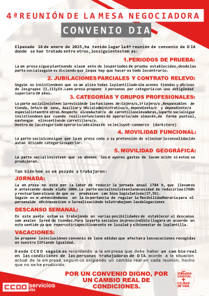 Desde CCOO seguimos recordando a la empresa que debe haber un cambio real en las condiciones de las personas trabajadoras de DIA, acorde a la situación actual de la empresa, seguimos exigiendo un cambio real en cada reunión, hecho que no se ha producido.