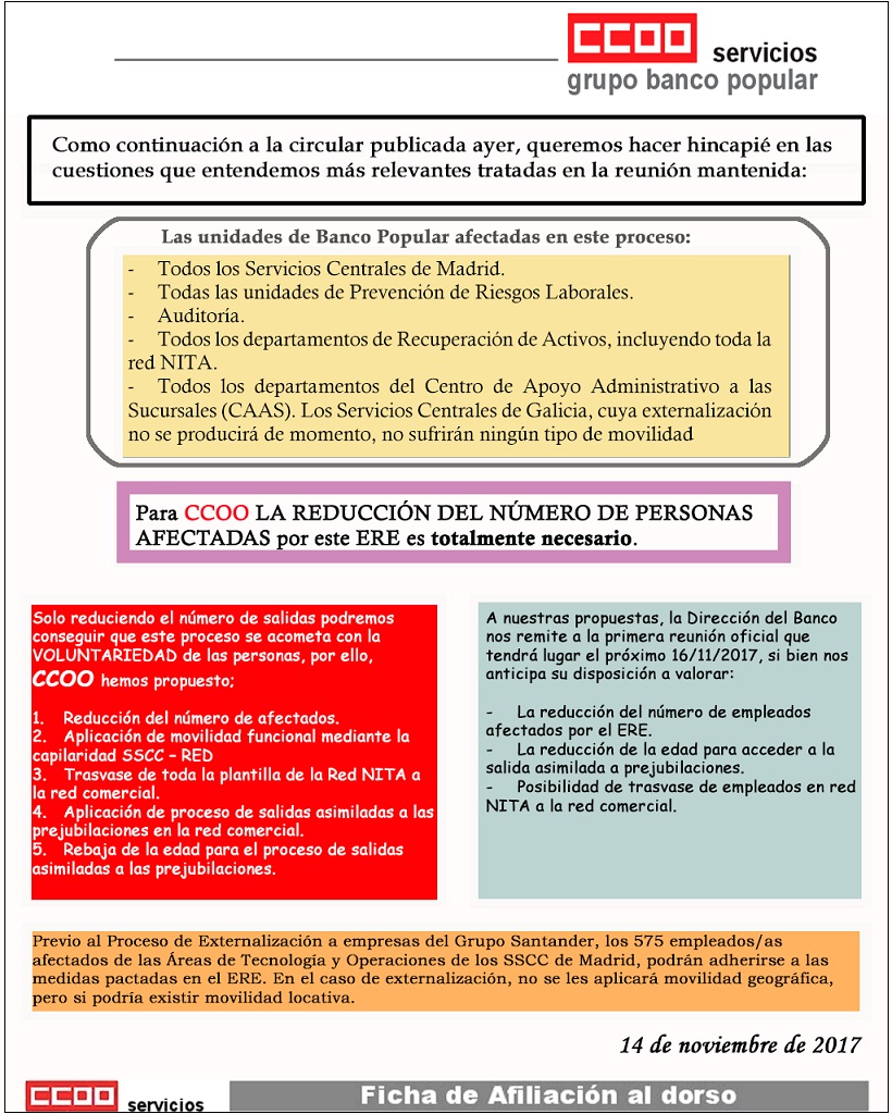 En este documento intentamos resumir la situación actual del ERE en Banco Popular, los centros afectados, las propuestas de CCOO y la posición tomada por la Dirección.