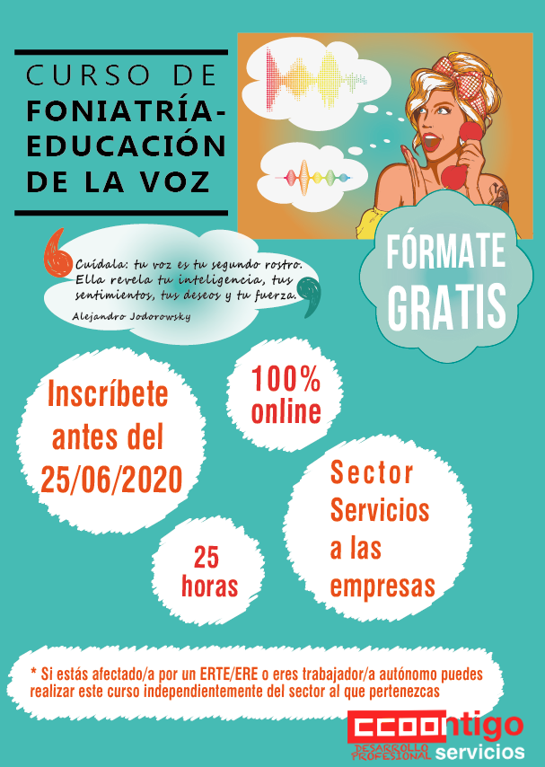 Adquirir pautas de higiene vocal para el uso correcto de la voz y evitación de patologías. Sector Servicios a las empresas. Si estás afectado por un ERTE/ERE  eres trabajador o trabajadora autónoma puedes realizar este curso independientemente del sector al que pertenezcas. Modalidad Teleformación.  Inscríbete.