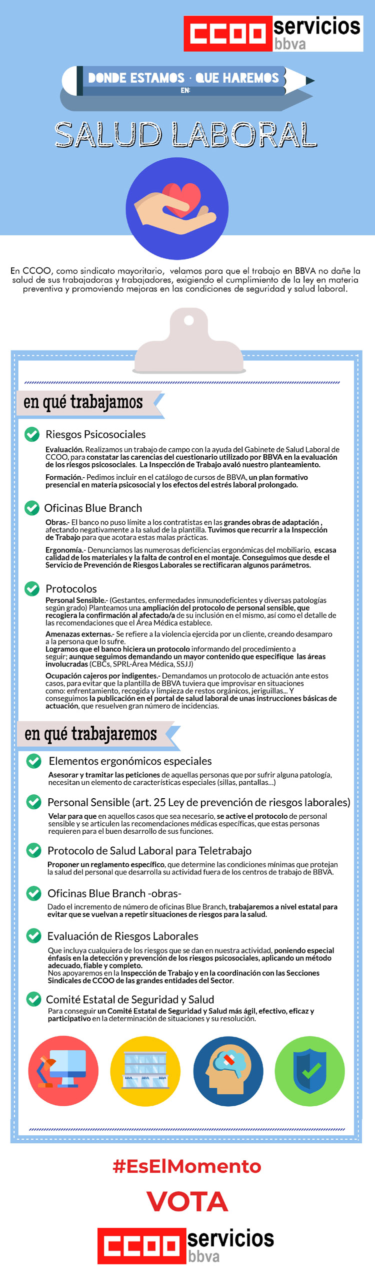 En CCOO, como sindicato mayoritario, velamos para que el trabajo en BBVA no dañe la salud de sus trabajadoras y trabajadores, exigiendo el cumplimiento de la ley en materia preventiva y promoviendo mejoras en las condiciones de seguridad y salud laboral.