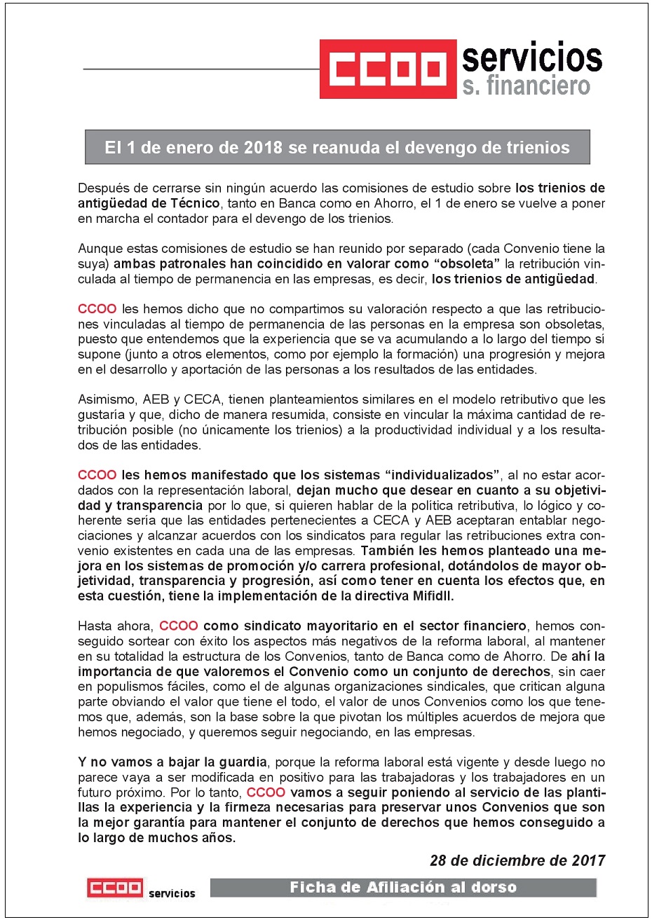 Después de cerrarse sin ningún acuerdo las comisiones de estudio sobre los trienios de antiguedad de Técnico, tanto en Banca como en Ahorro, el 1 de