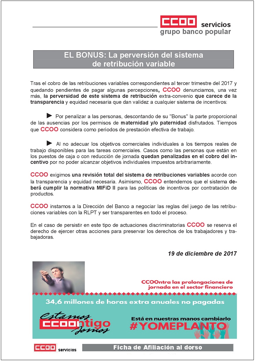 Tras el cobro de las retribuciones variables correspondientes al tercer trimestre del 2017 y quedando pendientes de pagar algunas percepciones, CCOO denunciamos, una vez más, la perversidad de este sistema de retribución extra-convenio que carece de la transparencia y equidad necesaria que dan validez a cualquier sistema de incentivo.