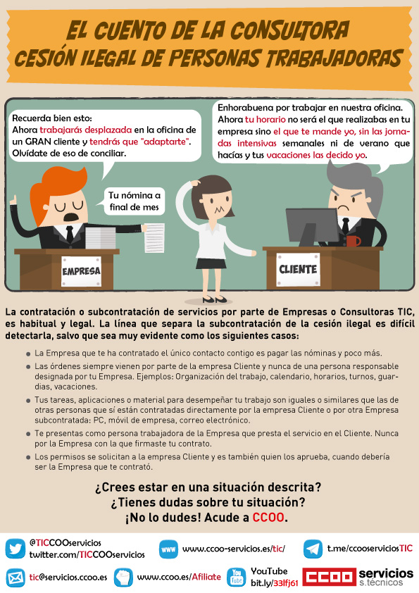 La contratación o subcontratación de servicios por parte de Empresas o Consultoras TIC, es habitual y legal. La línea que separa la subcontratación de la cesión ilegal es difícil detectarla, salvo que sea muy evidente como los siguientes casos: