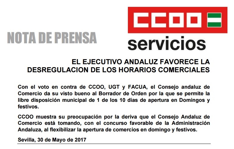 CCOO muestra su preocupación por la deriva que el Consejo Andaluz de Comercio está tomando, con el concurso favorable de la Administración Andaluza, al flexibilizar la apertura de comercios en domingo y festivos.