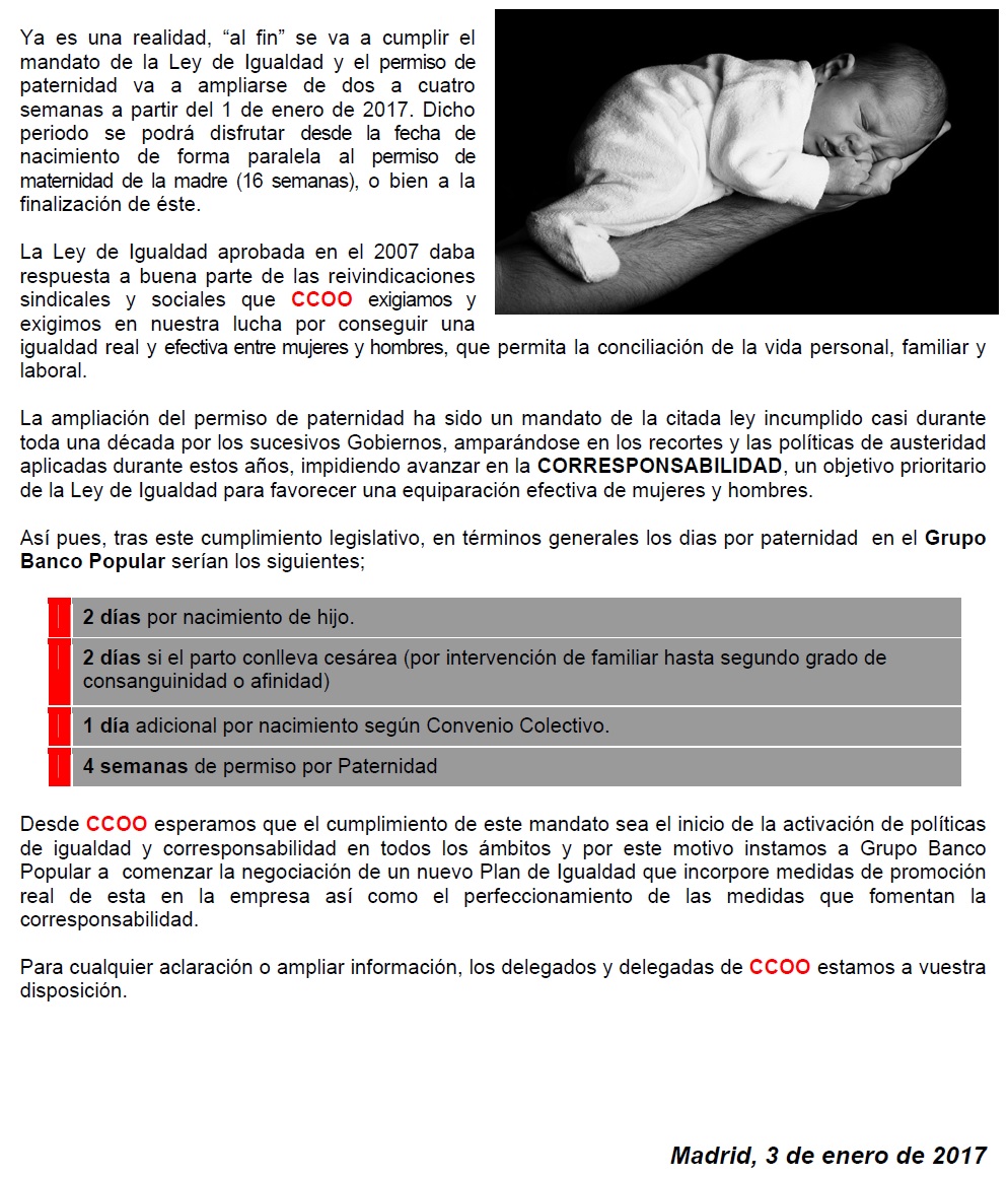 Ya es una realidad, «al fin» se va a cumplir el mandato de la Ley de Igualdad y el permiso de paternidad va a ampliarse de dos a cuatro semanas a partir del 1 de enero de 2017.