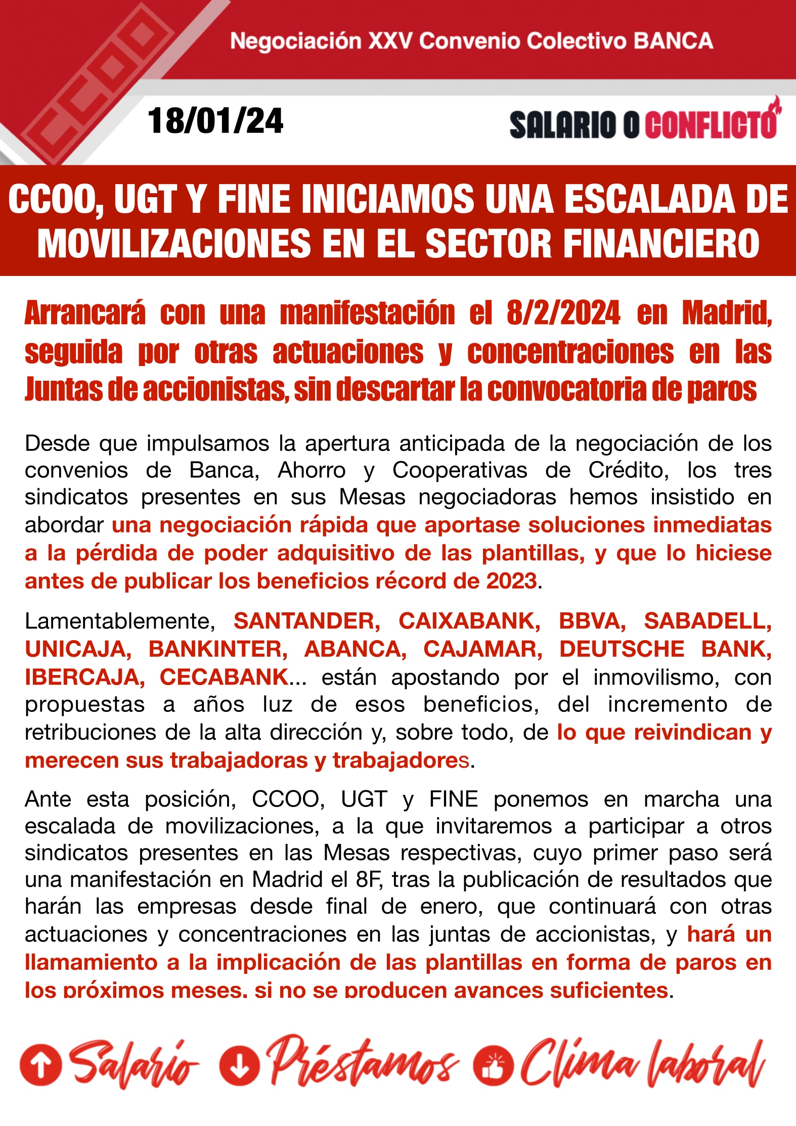 CCOO, UGT Y FINE inician una escalada de movilizaciones en el sector financiero