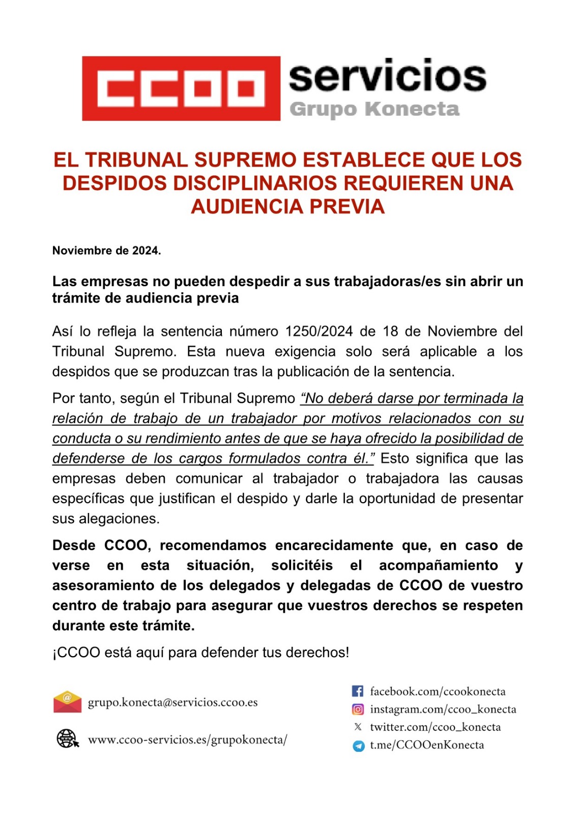 Desde CCOO, recomendamos encarecidamente que, en caso de verse en esta situación, solicitéis el acompañamiento y asesoramiento de los delegados y delegadas de CCOO de vuestro centro de trabajo para asegurar que vuestros derechos se respeten durante este trámite.