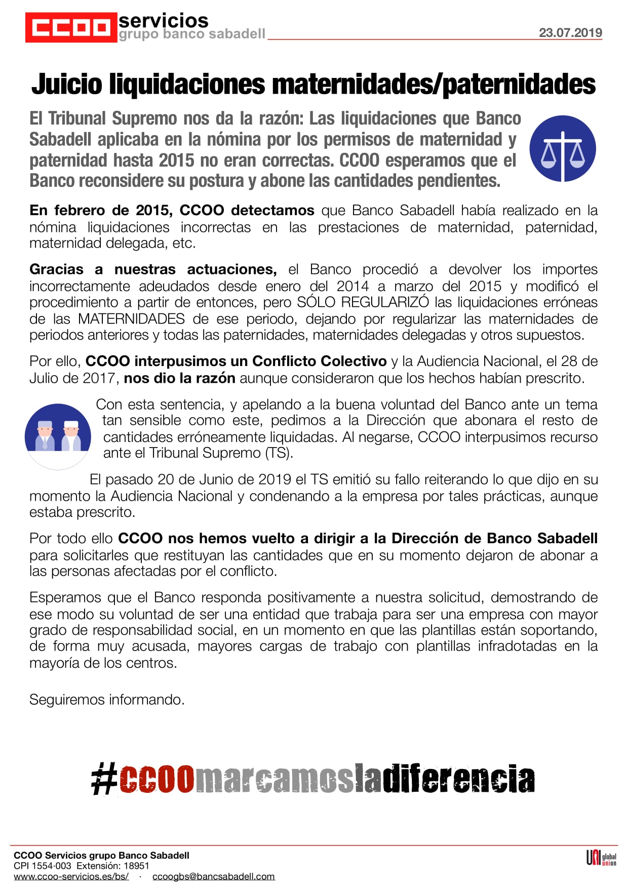 CCOO hemos pedido al Banco que restituya las cantidades que dejaron de liquidar de los permisos de materidad y paternidad