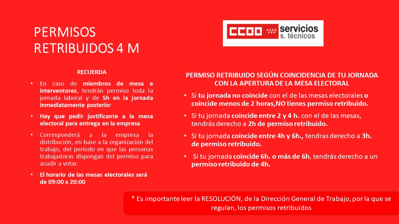 Estimado compañero/a , te indicamos a continuación información de cómo realizar el voto por correo , solicitándolo vía WEB sin necesidad de acudir presencialmente a una oficina de Correos , así como los Permisos Retribuidos de cara a las elecciones del próximo 4 de Mayo: