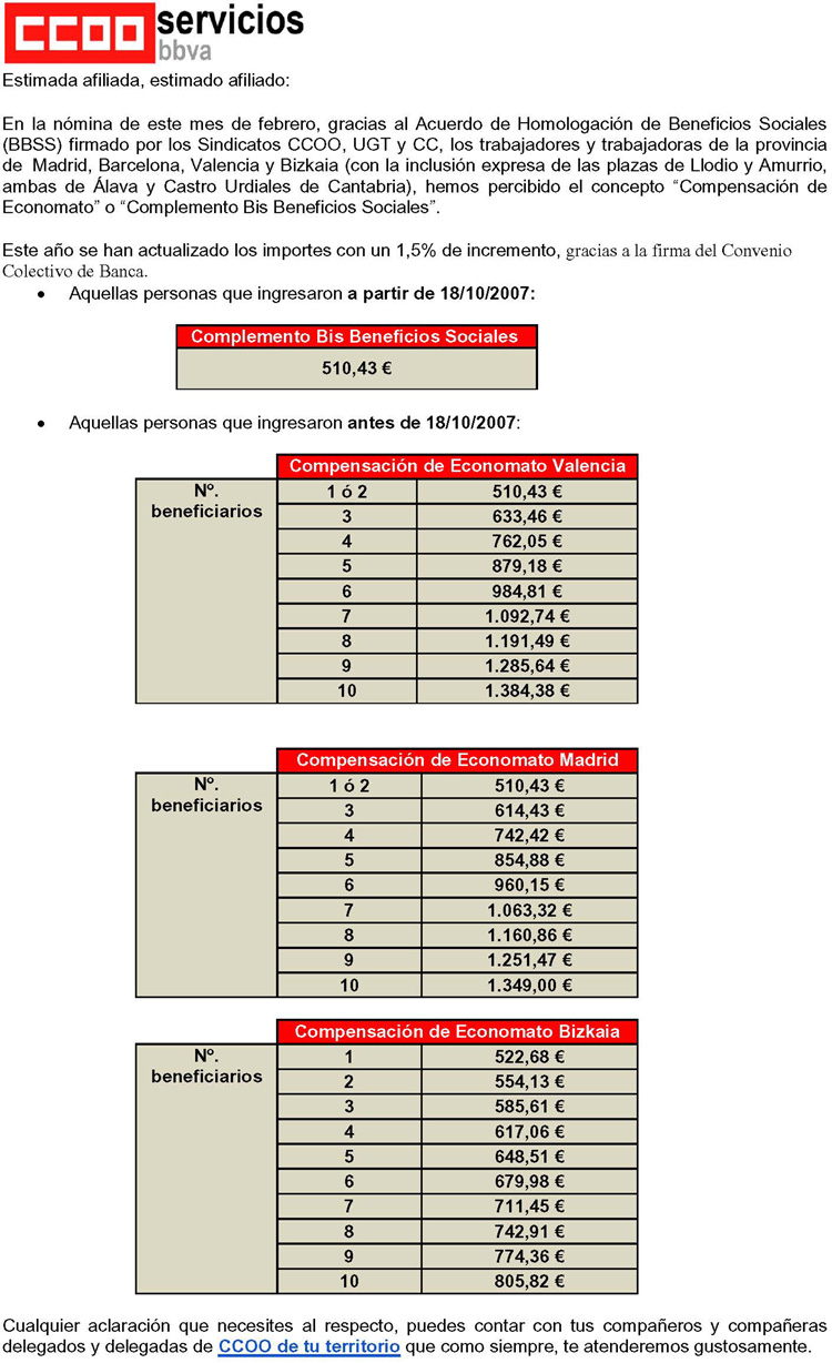 En la nómina de este mes de febrero, gracias al Acuerdo de Homologación de Beneficios Sociales (BBSS) firmado por los Sindicatos CCOO, UGT y CC, los trabajadores y trabajadoras de la provincia de Madrid, Barcelona, Valencia y Bizkaia (con la inclusión expresa de las plazas de Llodio y Amurrio, ambas de Álava y Castro Urdiales de Cantabria), hemos percibido el concepto «Compensación de Economato» o «Complemento Bis Beneficios Sociales».