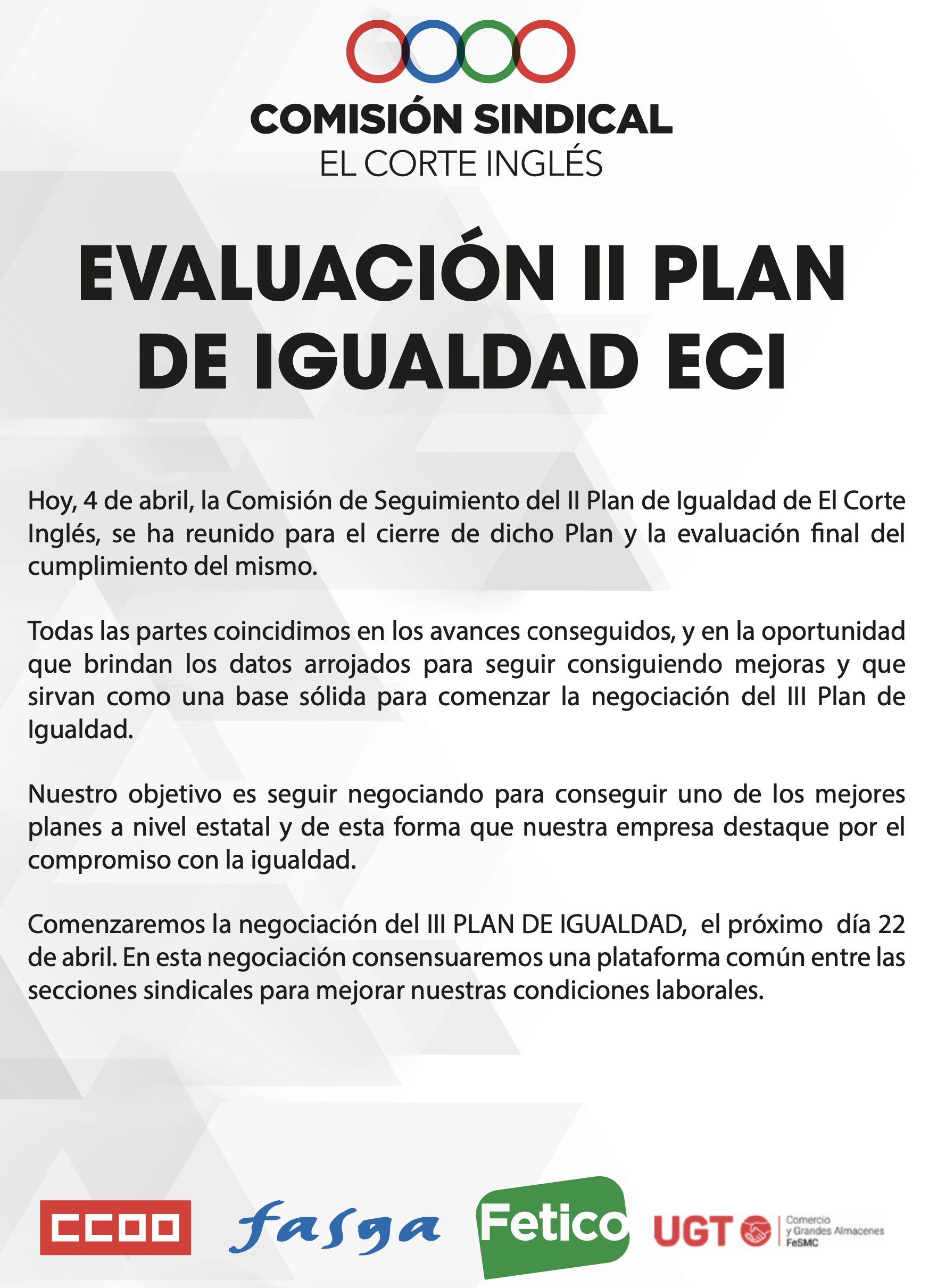 Hoy,4 de abril, la Comisión de Seguimiento del Il Plan de Igualdad de El Corte Inglés, se ha reunido para el cierre de dicho Plan y la evaluación final del cumplimiento del mismo.