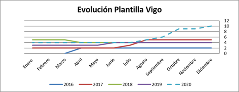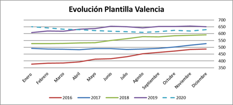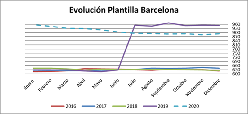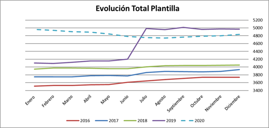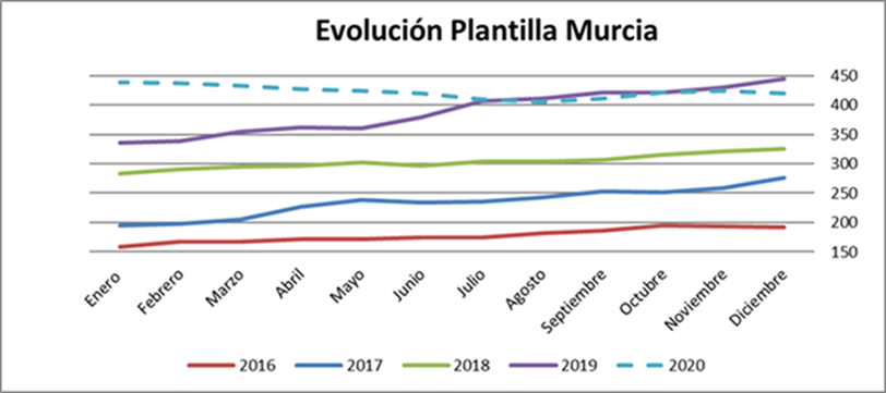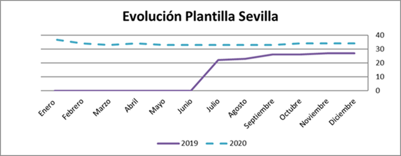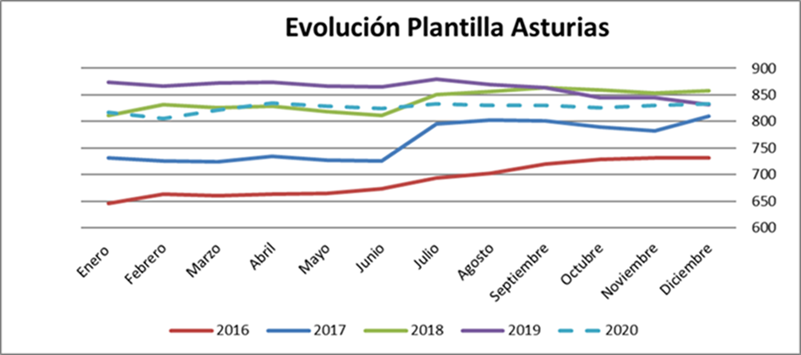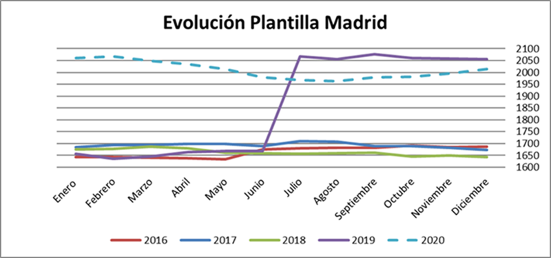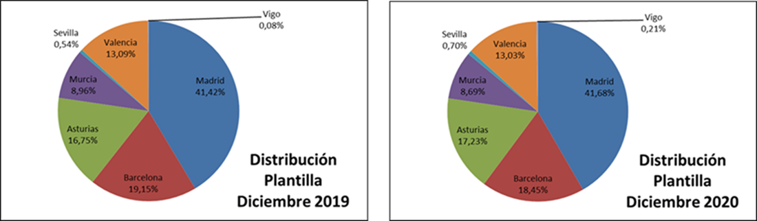 Por centros, Madrid continua teniendo el mayor número de trabajadores de la empresa, seguido de Barcelona y Asturias. Madrid por otra parte es el centro con una evolución de la plantilla más variable si bien estos últimos meses apunta ligeramente al crecimiento. Por su parte, Vigo, continua creciendo, pero al ser un centro pequeño, el incremento no parece aún una tendencia relevante. Por su parte el resto de territorios Barcelona , Murcia, Asturias, Valencia y Sevilla se han mantenido estables. Como conclusión hemos finalizado el año con una pérdida de trabajadores respecto a 2019 en todos los centro a excepción de Sevilla y Vigo.