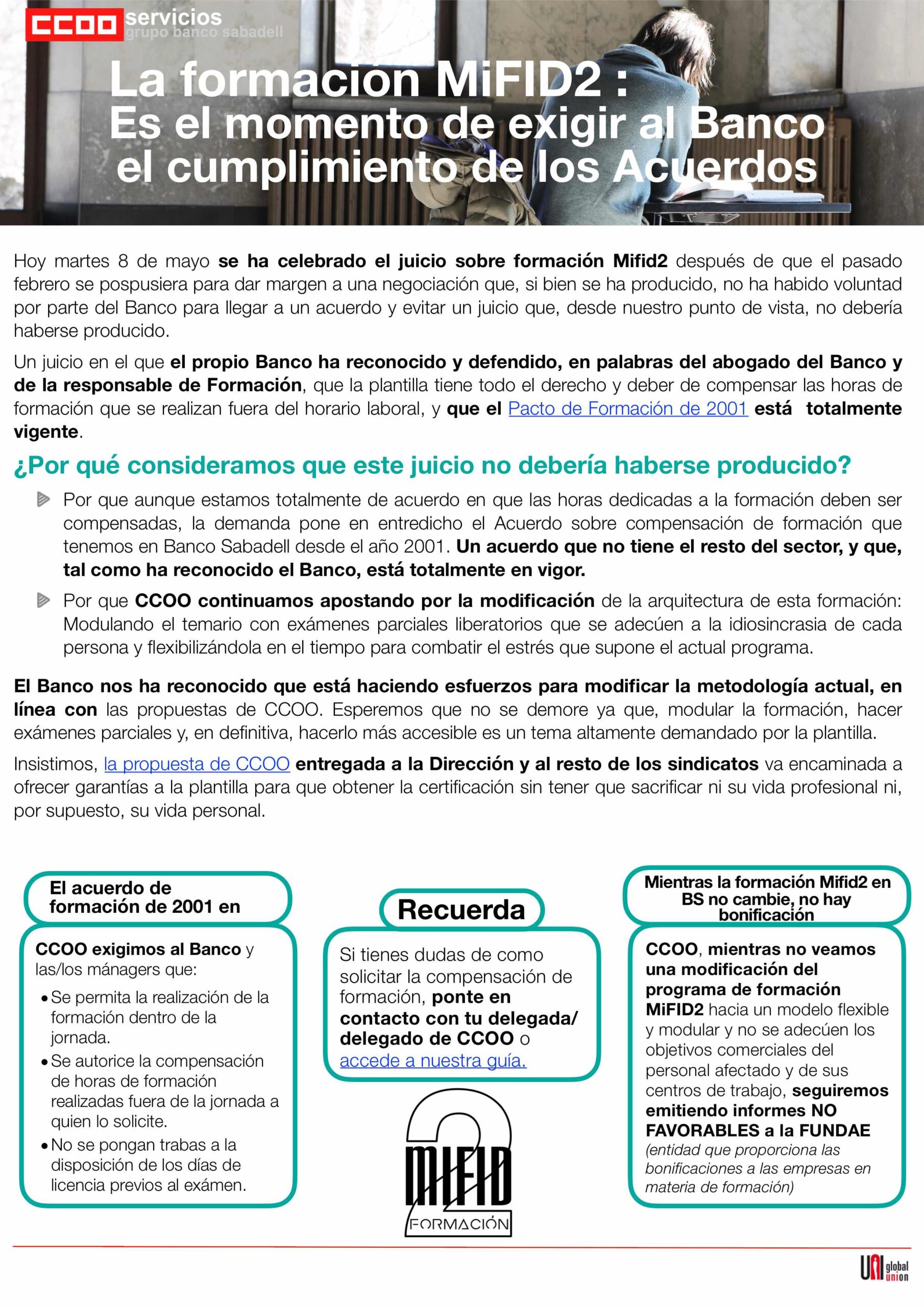 Un juicio en el que el propio Banco ha reconocido y defendido, en palabras de su abogado y de la responsable de Formación del Banco, que la plantilla tiene todo el derecho y deber de compensar las horas de formación que se realizan fuera del horario laboral…
