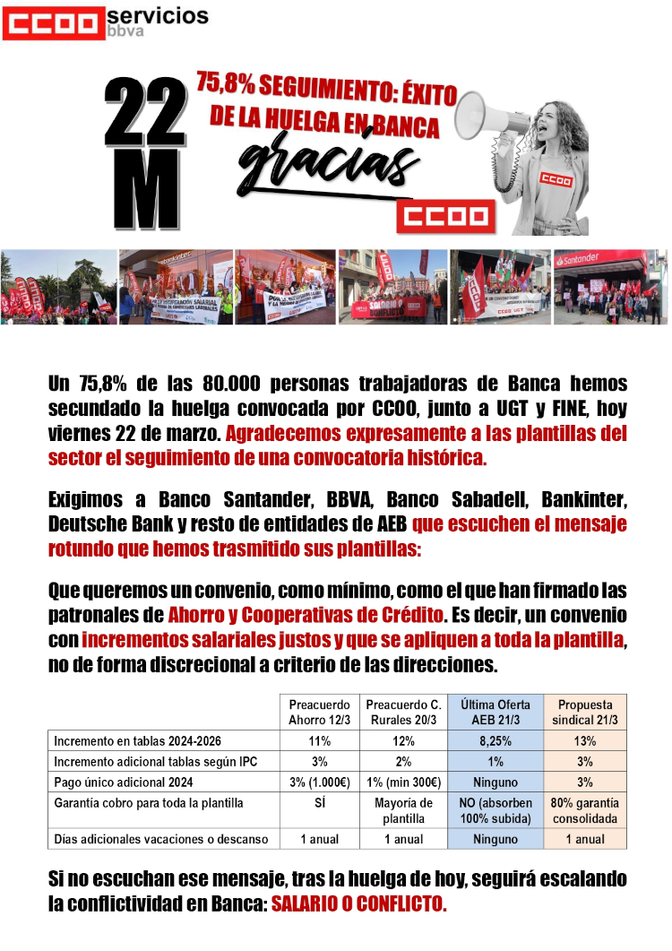 Un 75,8% de las 80.000 personas trabajadoras de Banca hemos secundado la huelga convocada por CCOO, junto a UGT y FINE, hoy viernes 22 de marzo. Agradecemos expresamente a las plantillas del sector el seguimiento de una convocatoria histórica.