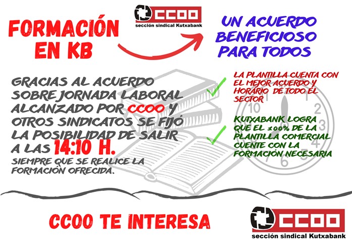 Los datos facilitados por Kutxabank demuestran que el acuerdo sobre horario y formación que firmamos ha sido todo un éxito, tanto para la plantilla que cuenta con el mejor horario como para la empresa que puede presumir de tener a toda la plantilla certificada para el negocio.