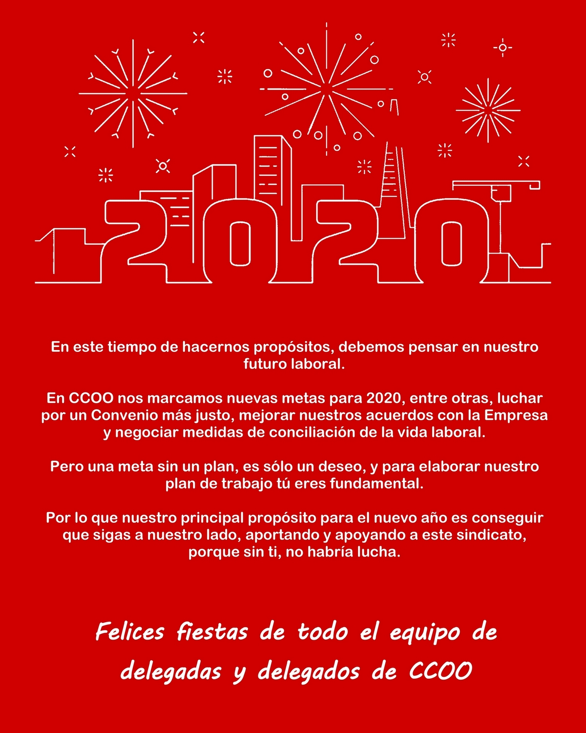 En este tiempo de hacernos propósitos, debemos pensar en nuestro futuro laboral. En CCOO nos marcamos nuevas metas para 2020, en otras, negociar un Convenio más justo, mejorar nuestros acuerdos con la Empresa y negociar medidas de conciliación de la vida laboral.