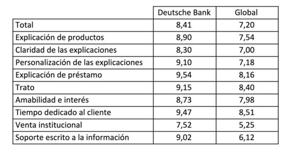 “Con una puntuación de 8,41 sobre 10, el banco [Deutsche Bank] se sitúa como líder en el ranking en España por cuarto año consecutivo, superando la puntuación media del sector”.