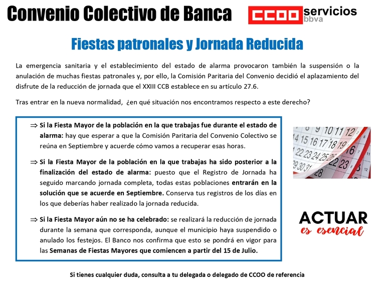 La emergencia sanitaria y el establecimiento del estado de alarma provocaron también la suspensión o la anulación de muchas fiestas patronales y, por ello, la Comisión Paritaria del Convenio decidió el aplazamiento del disfrute de la reducción de jornada que el XXIII CCB establece en su artículo 27.6.