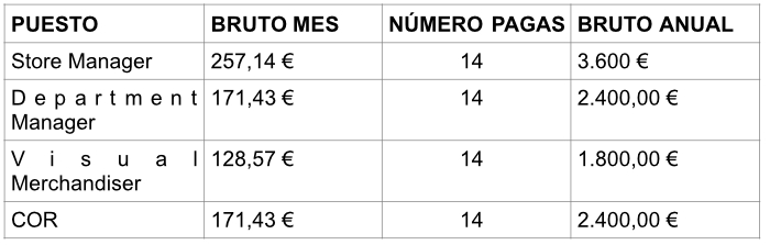 • Se garantiza un plus de responsabilidad mínimo por categoría, aplicable a Store Manager, Department Manager, Visual Merchandiser y COR.