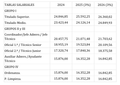- Incrementos salariales de un 4% de las tablas actuales para el año 2024, un 3% para el 2025 y otro 3% para el 2026. Además, se establece una cláusula de revisión salarial del 1% aplicable el 1 de enero del año siguiente, si el IPC de cada año de vigencia excediera de esos porcentajes. Las tablas salariales del 2024 serán de aplicación con efectos retroactivos desde el 1 de Enero de 2024.