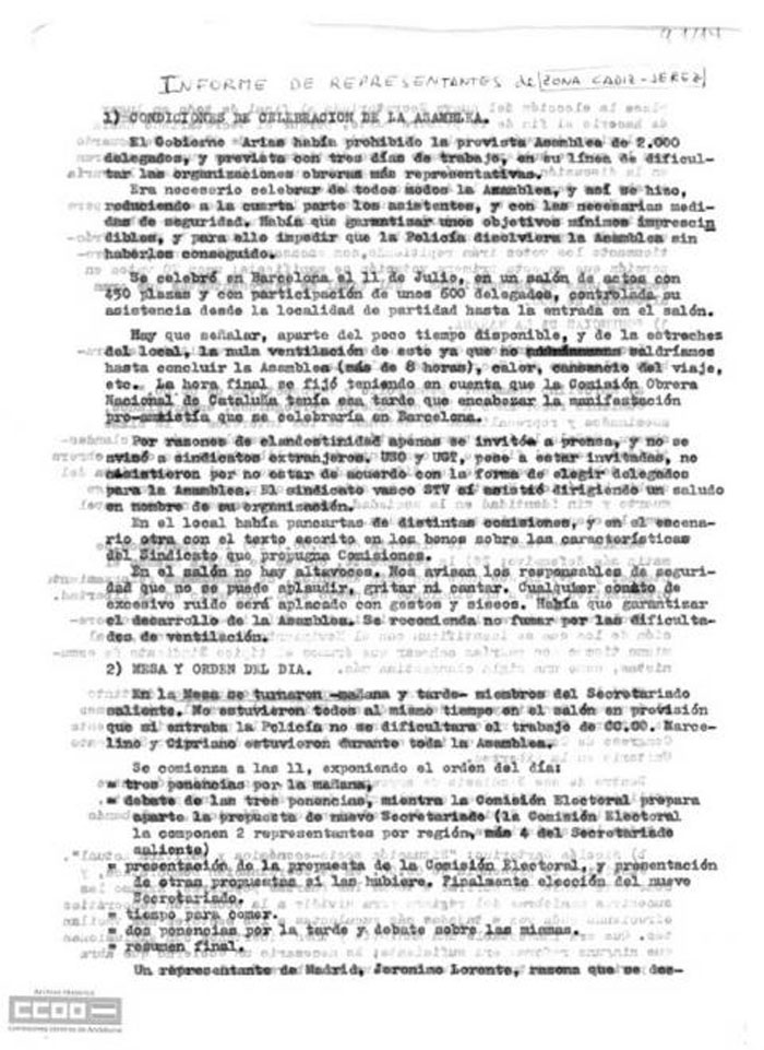 Con un calor asfixiante, como sardinas en lata, bajo la moderación de Cipriano García, las delegadas y delegados escucharon los informes de Marcelino Camacho, Nicolás Sartorius y Juan Muñiz Zapico, las conclusiones de Marcelino y la votación de las diferentes resoluciones.