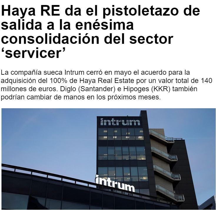 La compañía sueca Intrum cerró en mayo el acuerdo para la adquisición del 100% de Haya Real Estate por un valor total de 140 millones de euros. Diglo (Santander) e Hipoges (KKR) también podrían cambiar de manos en los próximos meses.